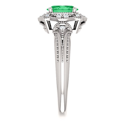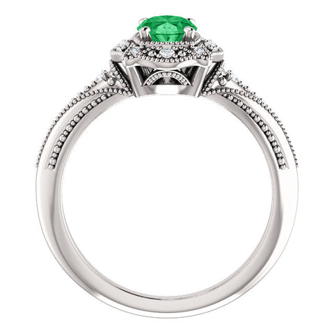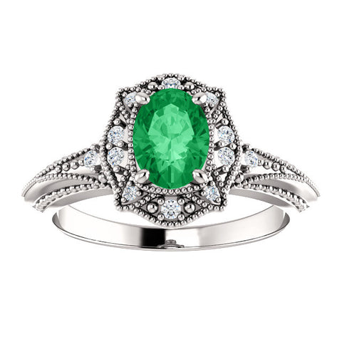 14K white gold ladies ring containing one oval cut faceted natural emerald, measuring approximately 7.0 x 5.0mm, weighing approximately 3/4 carats, AA quality, slightly included, twelve round full cut faceted diamond accents, weighing approximately .10ctw. Rhodium plated, Finger Size 7