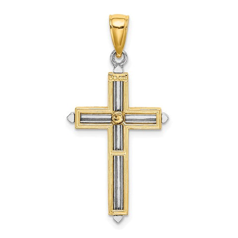 14 Karat yellow and white gold ladies cross, solid casting, measuring 33.4mm with bail.
