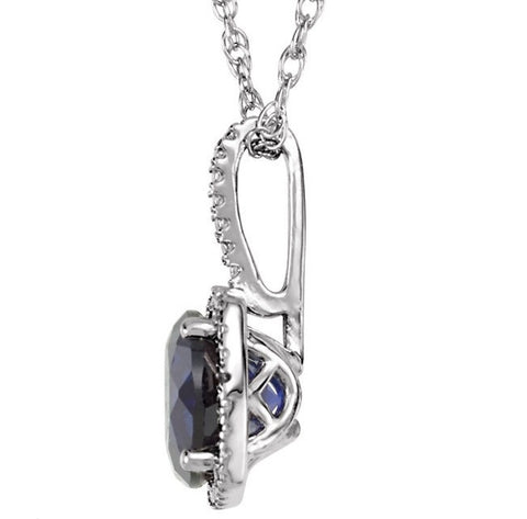 Lab Created Blue Sapphire and Diamond, 7mm round Created Blue Sapphire with Diamond accents, .015 ctw., Sterling Silver, 18" chain.