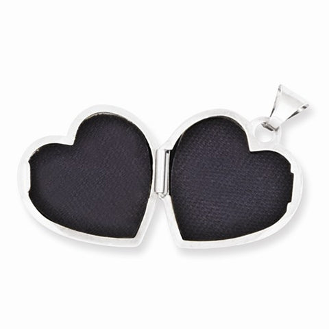 Sterling Silver small heart shaped die struck scroll design around polished heart front, holds two photos, measures 25mm x 16mm, chain sold separately.